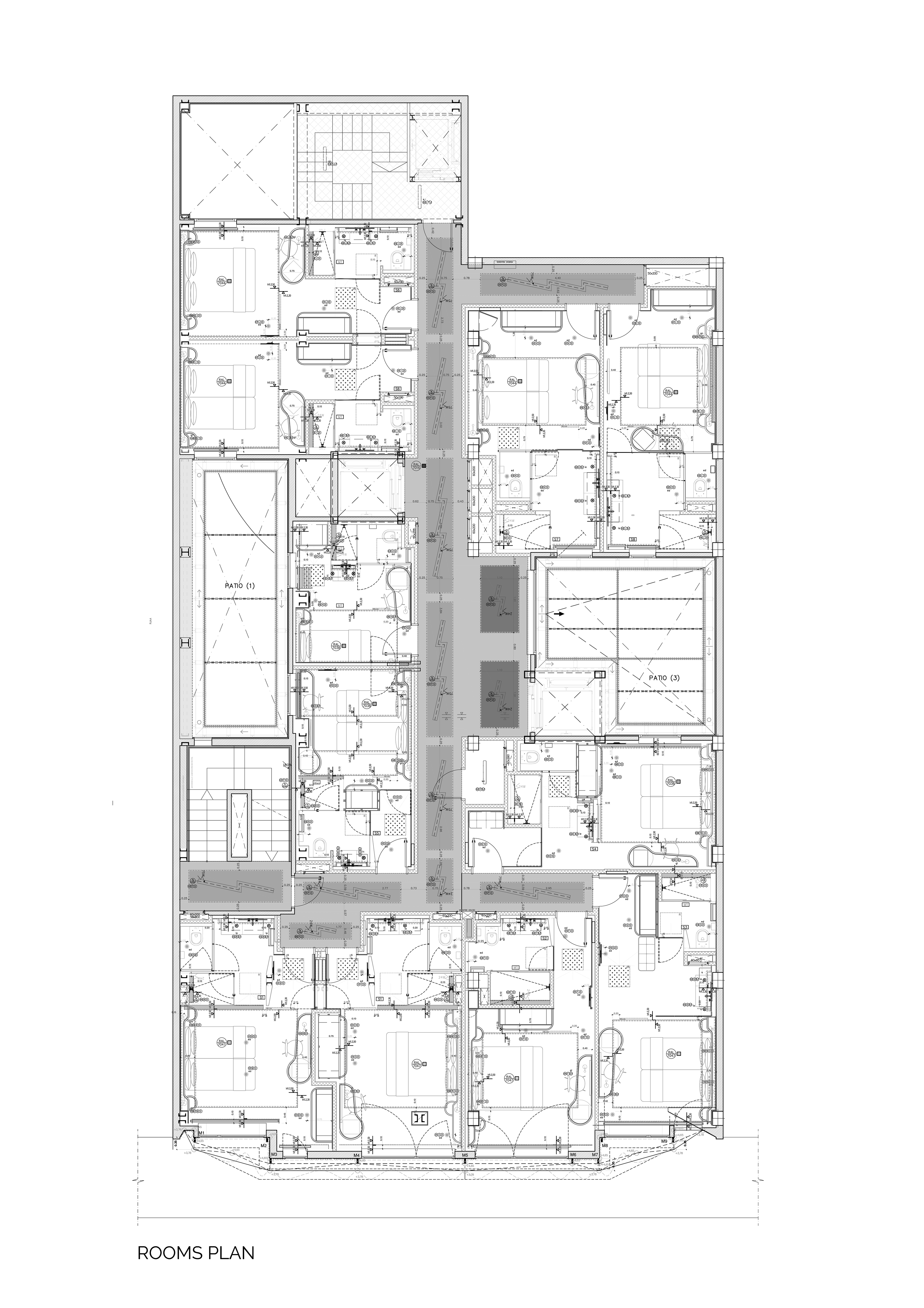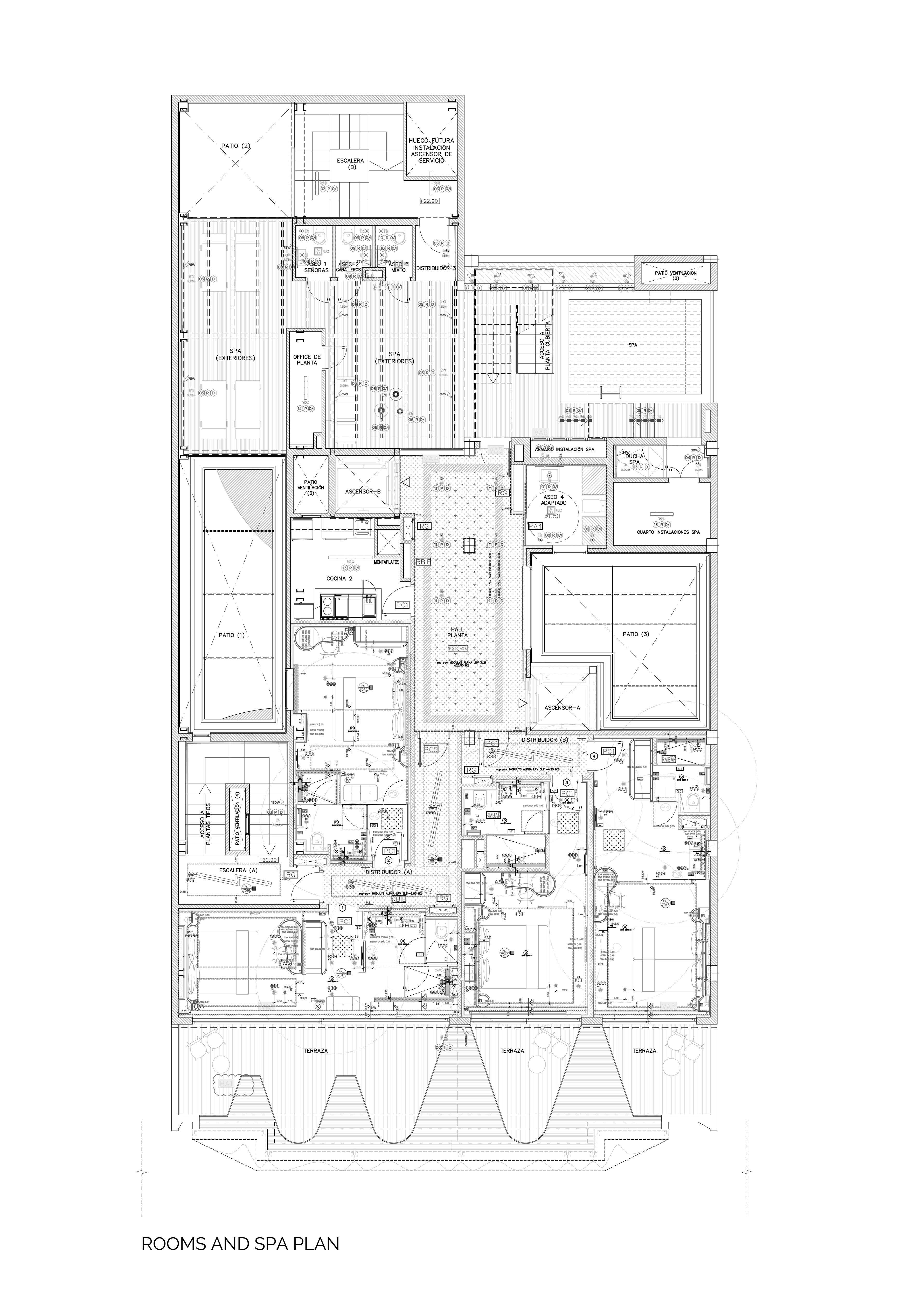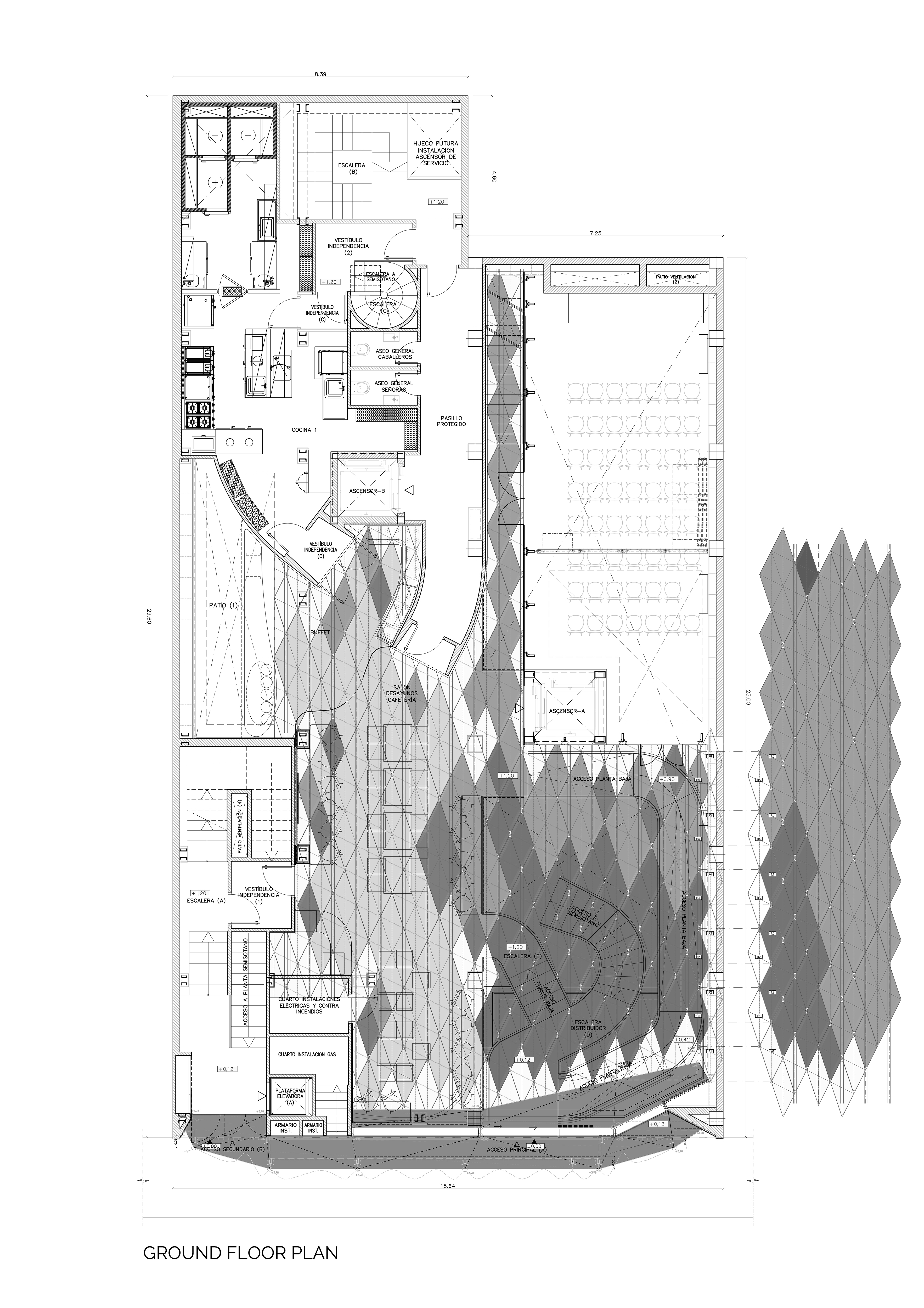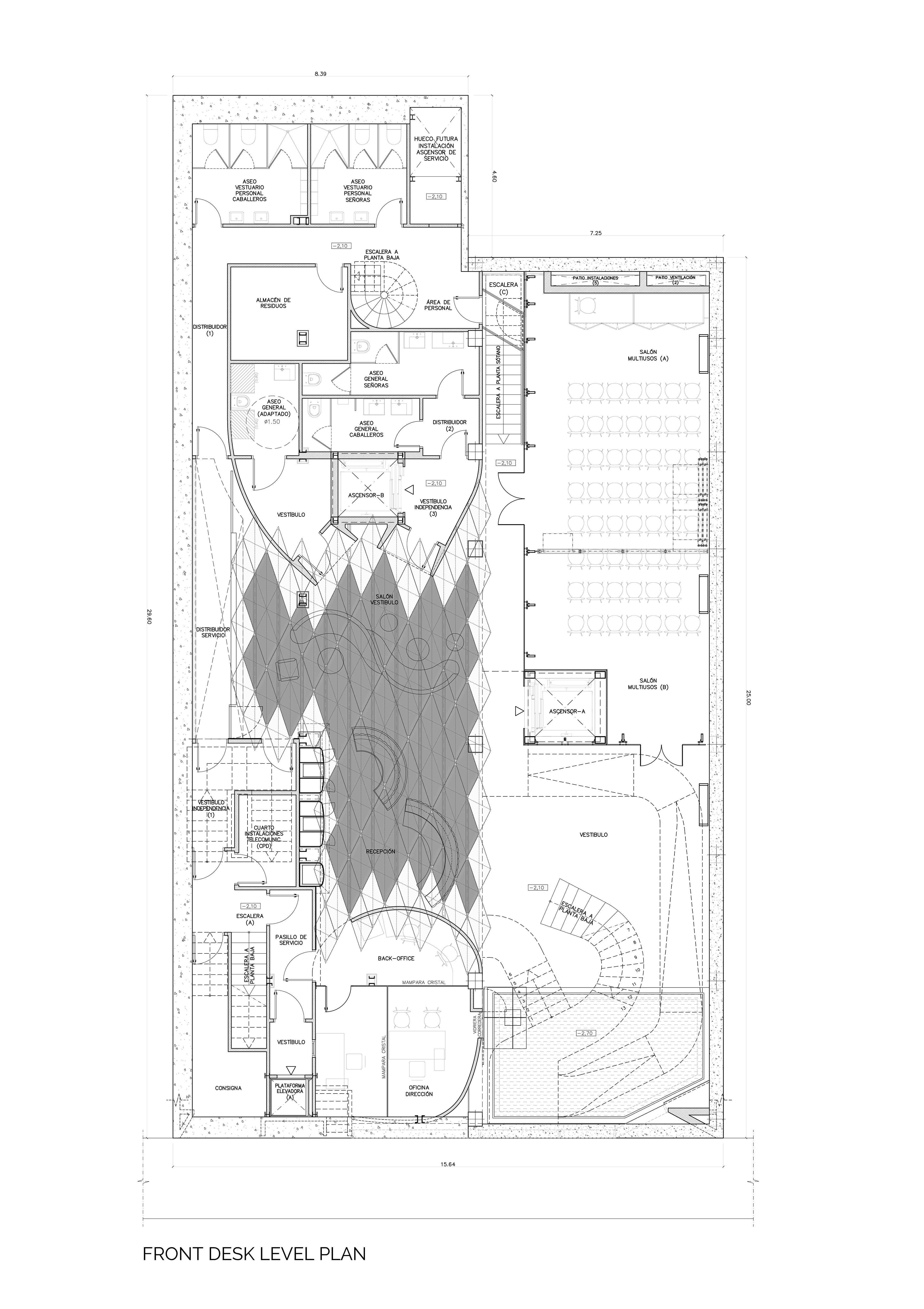 En planta de acceso, el proyecto organiza un vestíbulo de doble altura que actúa como espacio de transición entre el ámbito urbano y el interior del establecimiento hotelero. Este núcleo articulador alberga los usos comunes principales: en el nivel inferior se disponen la recepción y un salón polivalente, divisible mediante paneles móviles, mientras que en el nivel superior se sitúa la cafetería. La estrategia espacial de este ámbito responde a una lógica de continuidad visual y perceptiva con el exterior, concebido como una extensión filtrada del espacio urbano. Precisamente por este motivo, añadimos espejos al revestimiento de paneles en forma de diamante de la zona del lobby y patios. Los espejos se orientan al mostrador de recepción, por lo que el conjunto está pensado como un montaje visual que introduce la visión de la zona exterior de acceso al hotel en su interior de tal modo que el recepcionista pueda ver desde abajo lo que está ocurriendo en el nivel superior. Las circulaciones entre los distintos niveles que se generan en el interior del lobby y el ascensor panorámico se resuelven mediante un sistema de rampas fabricadas en estructura metálica y dos escaleras, una de ellas de planta helicoidal.
