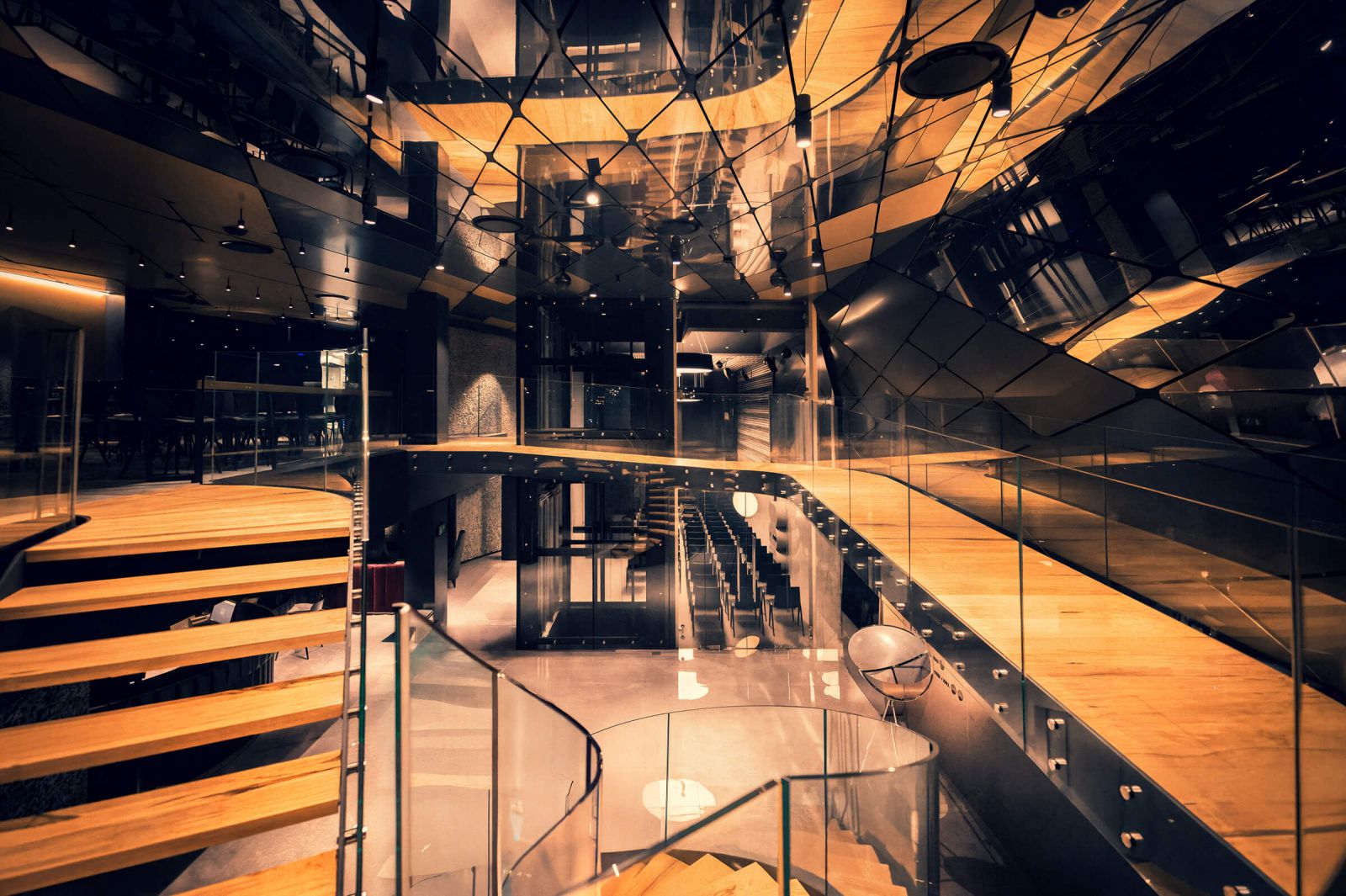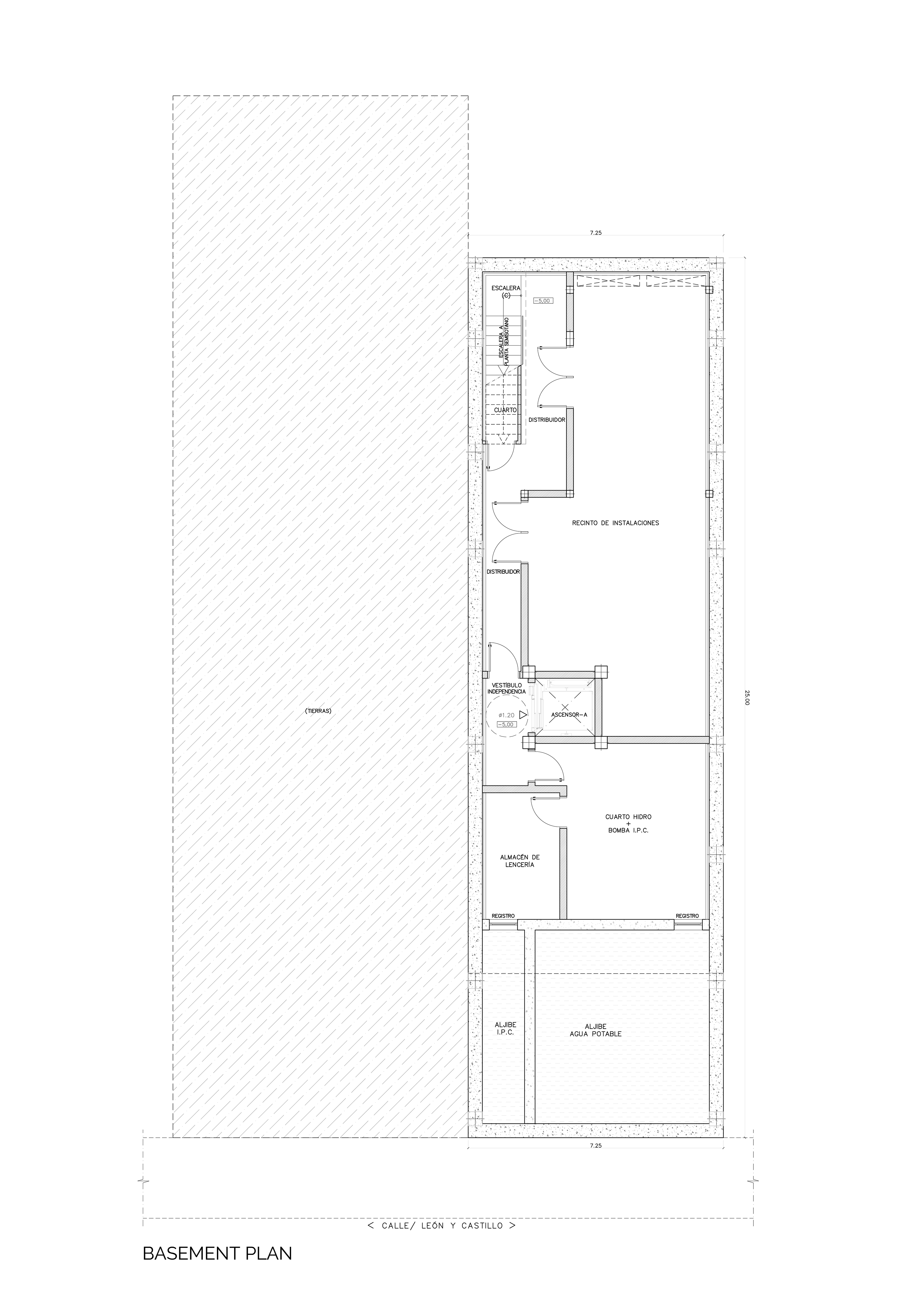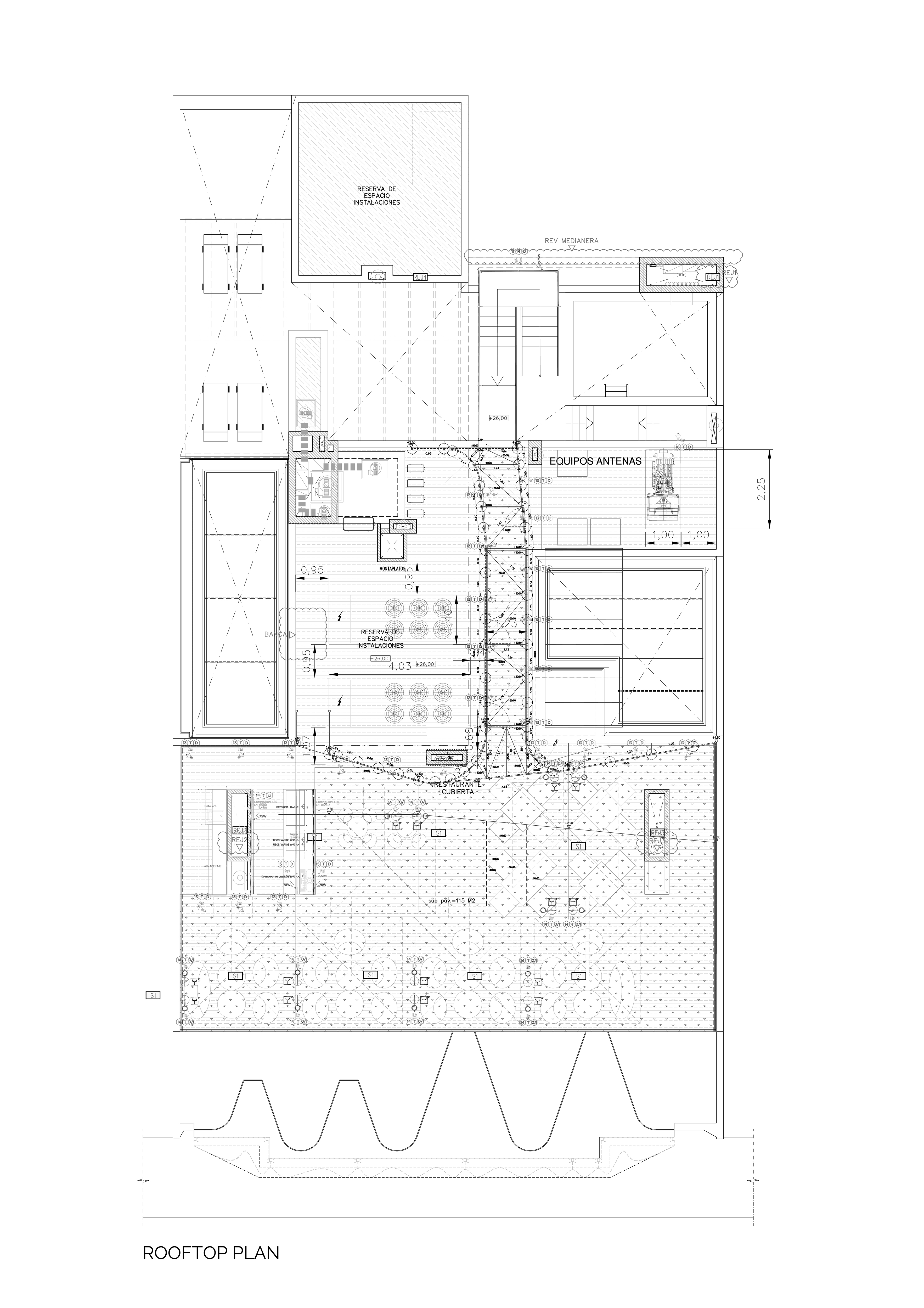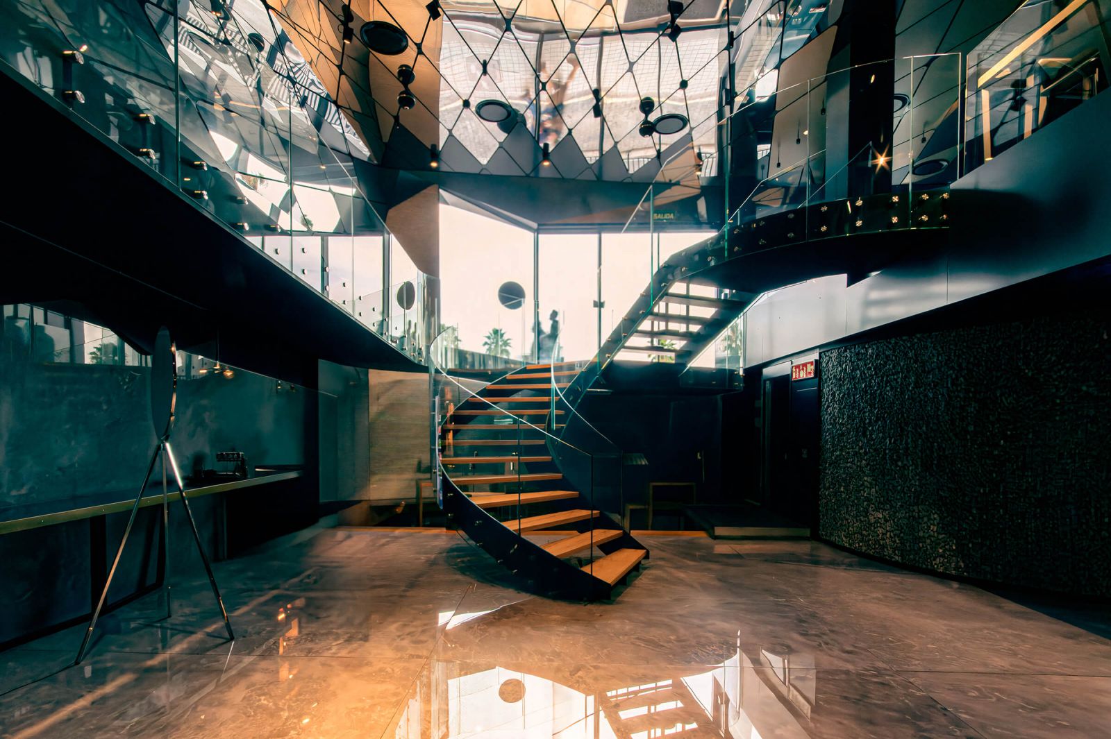 En planta de acceso, el proyecto organiza un vestíbulo de doble altura que actúa como espacio de transición entre el ámbito urbano y el interior del establecimiento hotelero. Este núcleo articulador alberga los usos comunes principales: en el nivel inferior se disponen la recepción y un salón polivalente, divisible mediante paneles móviles, mientras que en el nivel superior se sitúa la cafetería. La estrategia espacial de este ámbito responde a una lógica de continuidad visual y perceptiva con el exterior, concebido como una extensión filtrada del espacio urbano. Precisamente por este motivo, añadimos espejos al revestimiento de paneles en forma de diamante de la zona del lobby y patios. Los espejos se orientan al mostrador de recepción, por lo que el conjunto está pensado como un montaje visual que introduce la visión de la zona exterior de acceso al hotel en su interior de tal modo que el recepcionista pueda ver desde abajo lo que está ocurriendo en el nivel superior. Las circulaciones entre los distintos niveles que se generan en el interior del lobby y el ascensor panorámico se resuelven mediante un sistema de rampas fabricadas en estructura metálica y dos escaleras, una de ellas de planta helicoidal.