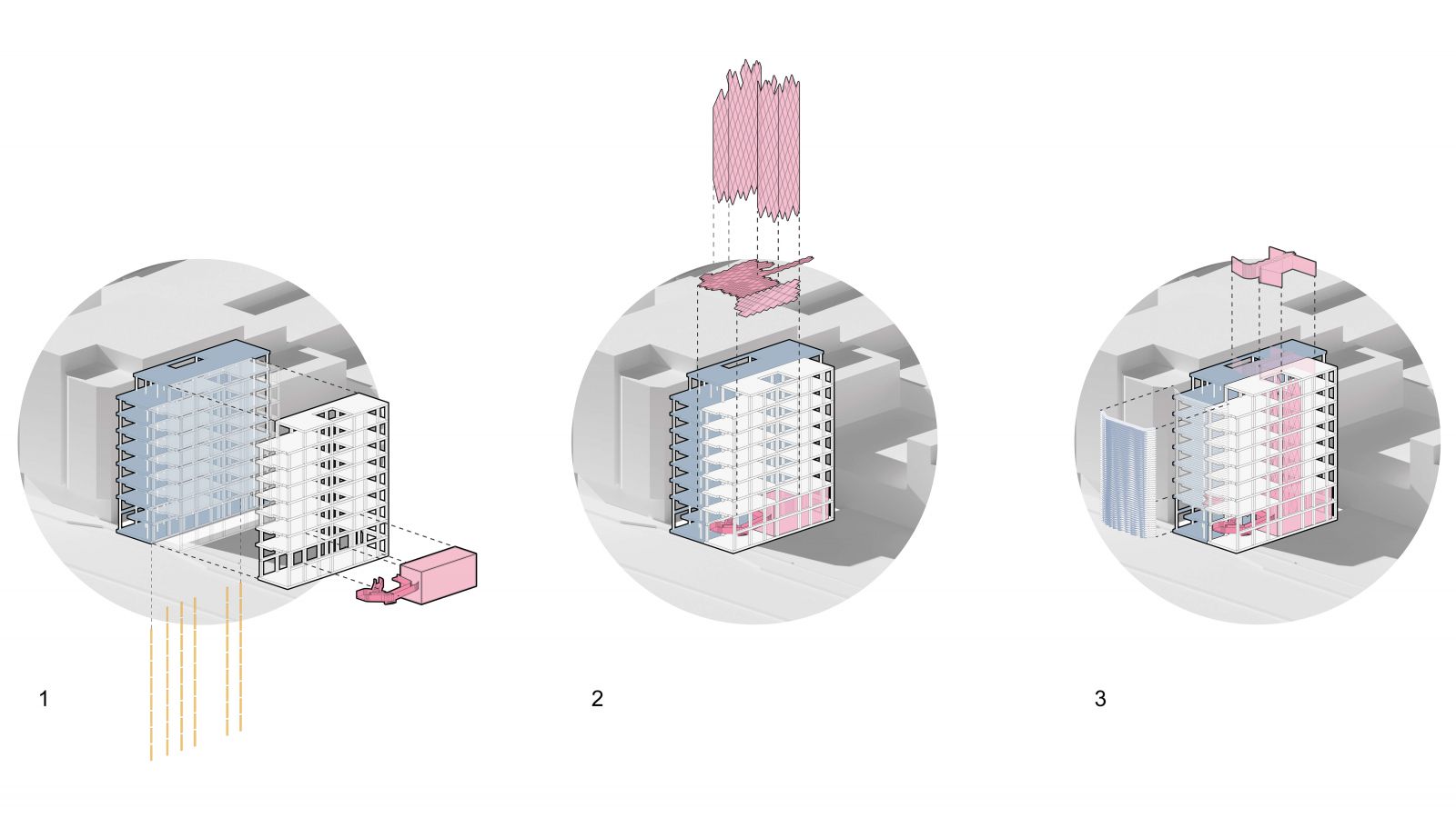 La intervención se articula en dos fases constructivas: por un lado, la rehabilitación estructural de un edificio preexistente con estructura metálica, la cual se refuerza para permitir su integración en un nuevo ciclo funcional sin incrementar la huella medioambiental; por otro, la edificación de un nuevo edificio con estructura de pórticos de hormigón armado sobre cimentación de micropilotes. El mecanismo estructural resultante, por medio del cual la segunda fase constructiva en hormigón armado termina por asumir parte de las cargas de la estructura metálica antigua, hace posible la demolición de una línea completa de pilares metálicos, abriendo nuevas opciones espaciales.