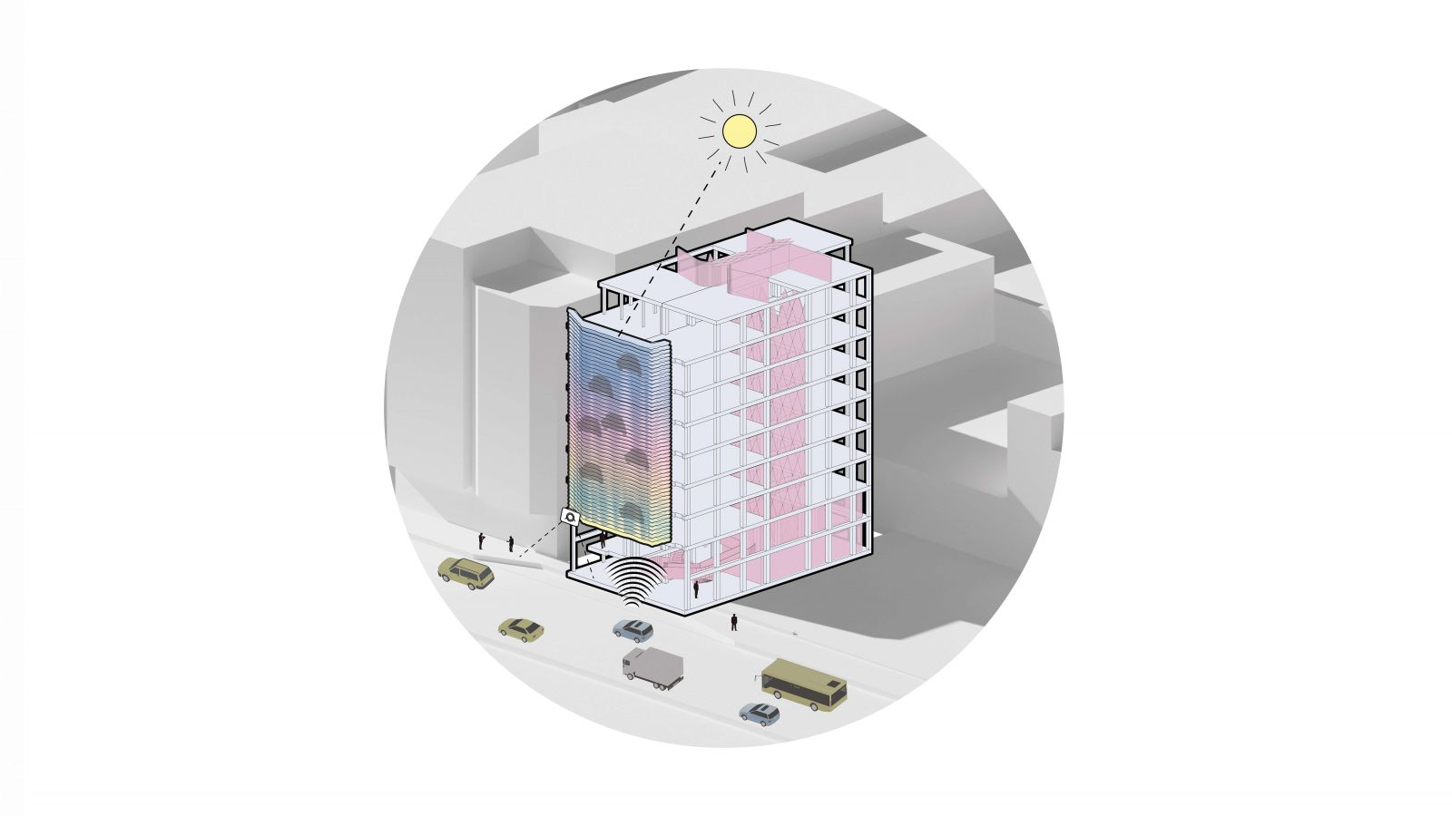 Desde una lectura fenomenológica, la luz no es tratada como un fenómeno físico absoluto, sino desde su dimensión temporal y afectiva: su variación configura la experiencia del habitar en el transcurso del día. Esta condición llevó al desarrollo de una estrategia de respuesta bifásica. Durante el día, la fachada opera como un dispositivo de regulación pasiva, controlando la incidencia solar mediante el uso de láminas dicróicas intercaladas en las 180 piezas que configuran las lamas. Estas capas generan efectos iridiscentes que varían en función del ángulo solar y del punto de vista del observador, instaurando una relación mutable entre el edificio y el paisaje. Durante la noche, el sistema se reconfigura: sensores de luz y sonido captan las intensidades del entorno urbano inmediato —faros de vehículos, ruido del tráfico— y los parametrizan en tiempo real, transformándolos en pulsos lumínicos que son emitidos nuevamente a la ciudad como una gran superficie retroalimentada, reconfigurando la fachada en una suerte de pantalla sensible, viva y situada.