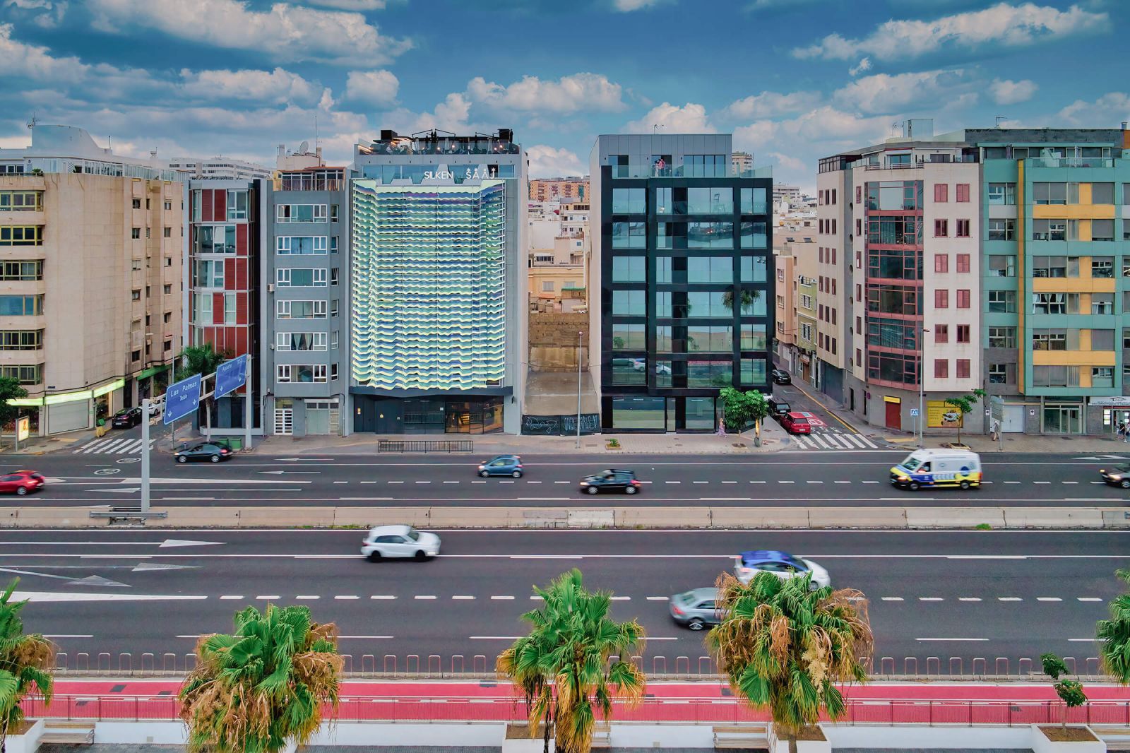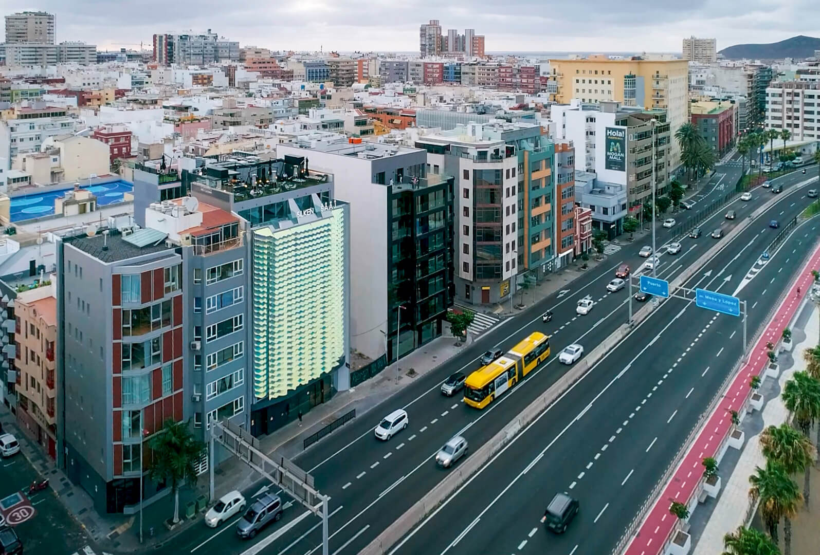 El hotel urbano SILKEN SAAJ se localiza en la primera línea del frente marítimo de Las Palmas de Gran Canaria, ocupando una posición liminal en la confluencia entre la bahía, la playa de Las Alcaravaneras y el Puerto de La Luz. El emplazamiento —con exposición directa al mar, orientación este y colindancia con una arteria de alta densidad vehicular transitada por 135.000 vehículos diarios— impone un paisaje complejo donde la incidencia de la luz solar directa y el ruido del tráfico constantes configuran una situación de alta exigencia ambiental. Estos dos estímulos dominantes —luz y ruido— son codificados como variables primarias para el diseño y activación del sistema envolvente. La estrategia proyectual, bien lejos de tratar de aplacar estos estímulos, busca reintegrarlos como materia operativa del diseño.