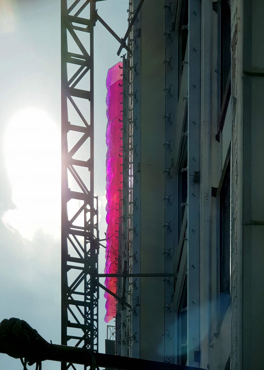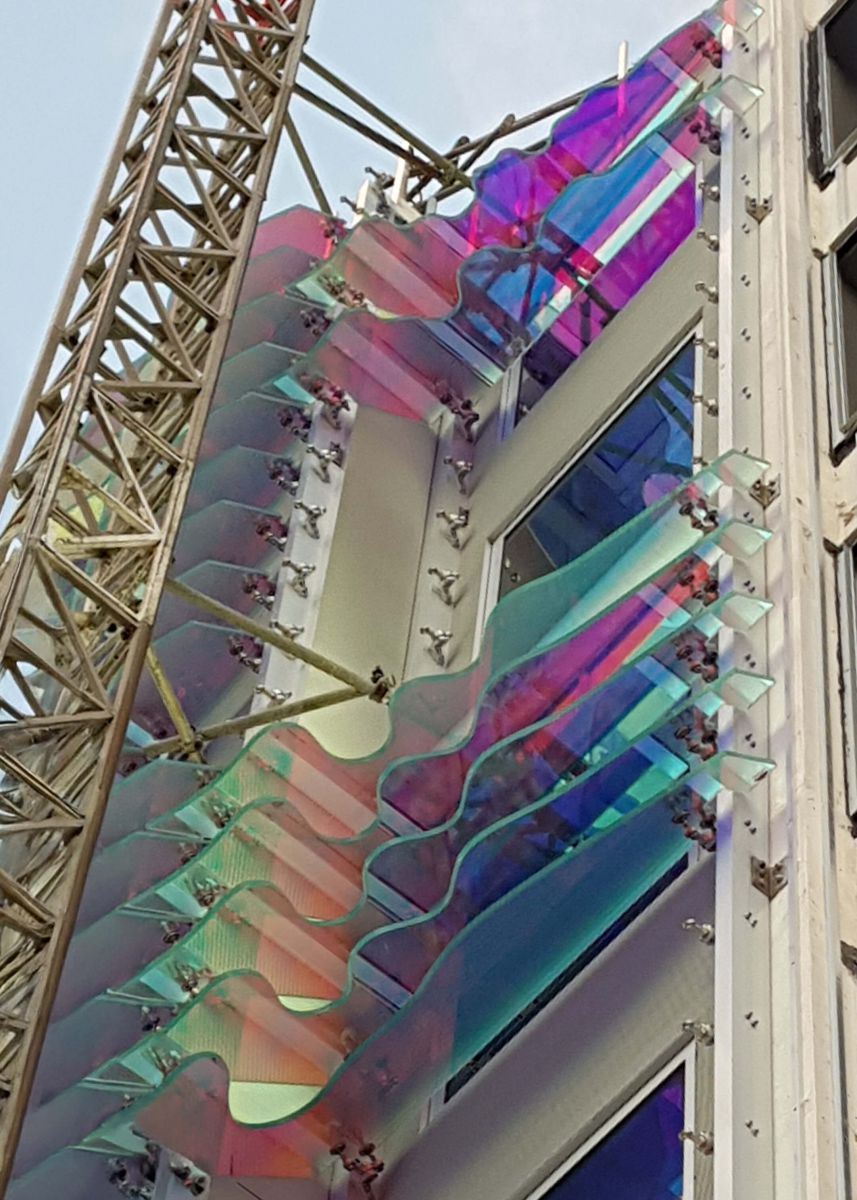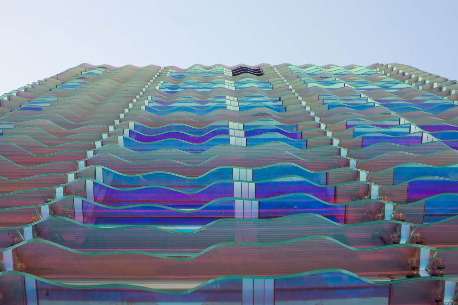 Formal y materialmente, la fachada se compone de una matriz de lamas de vidrio, cuyo diseño paramétrico simula la caída gravitacional de un textil, logrando un efecto plástico de fluctuación y movimiento latente. Esta morfología es resultado de un proceso de fabricación digital avanzada, que culmina en la producción mediante CNC de 180 piezas únicas de vidrio, cada una respondiendo a condiciones específicas de su posición en la envolvente.