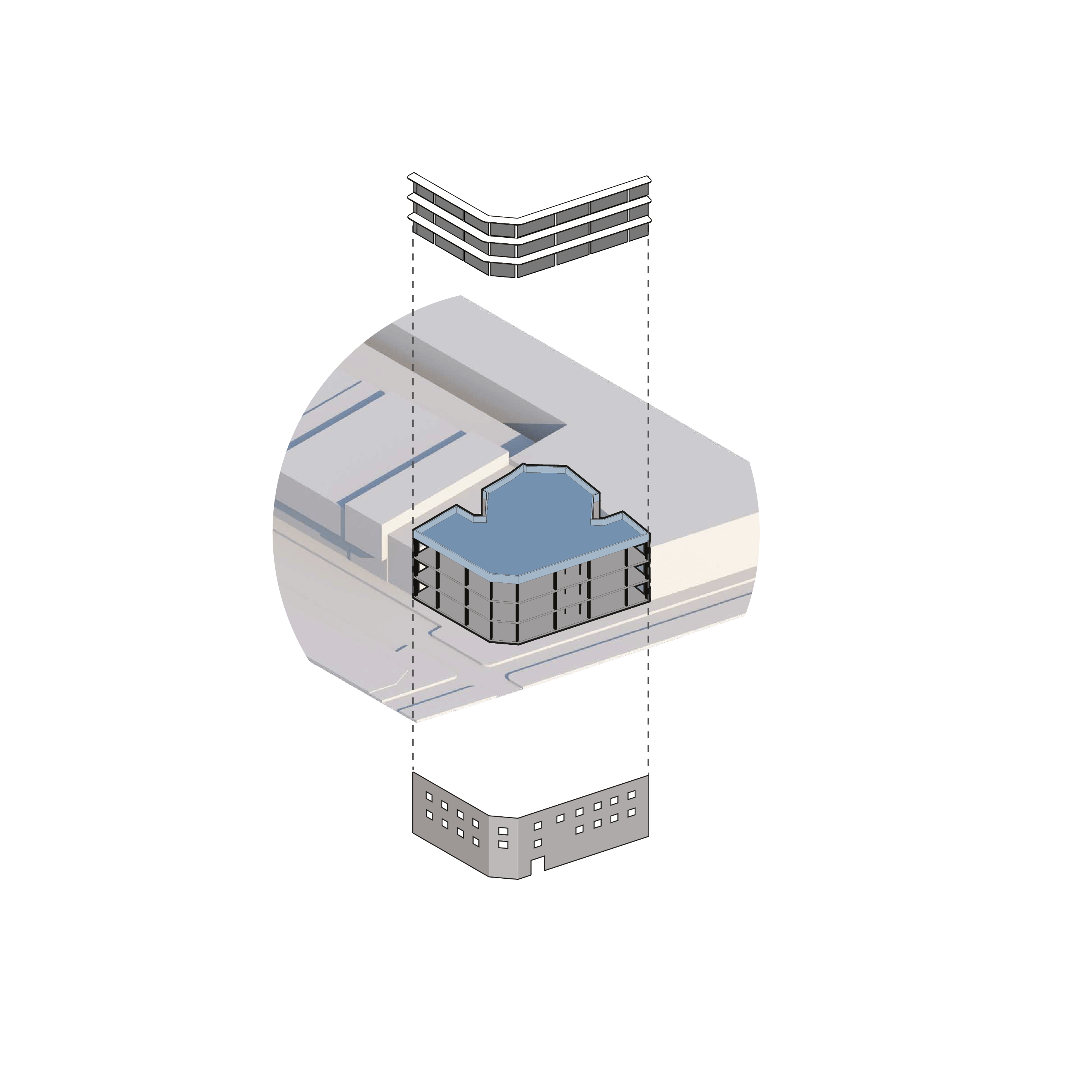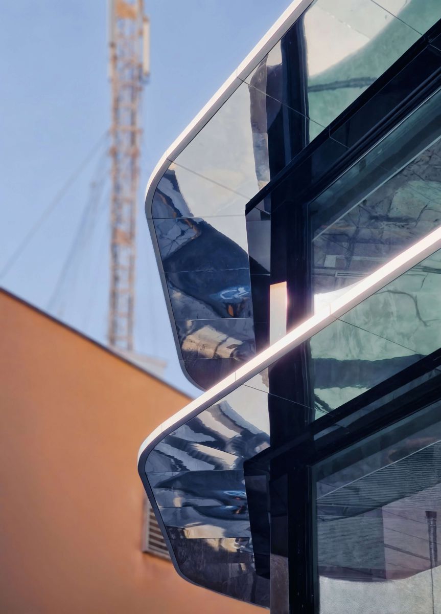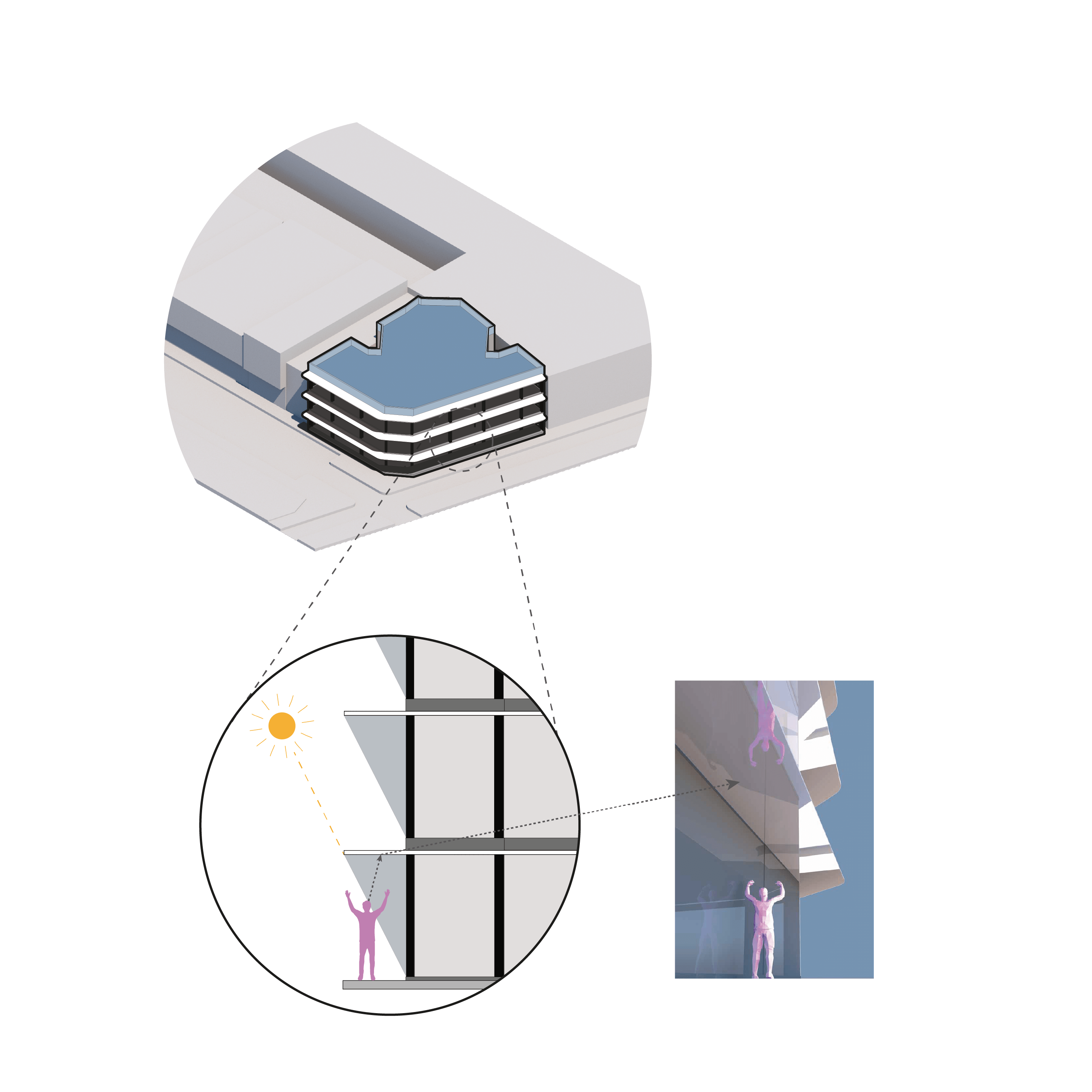 Los voladizos se conciben como grandes espejos hacia la calle que cumplen una doble función. Por un lado, intervienen en la regulación del intercambio energético edificio-entorno a través de la graduación de la radiación solar. Por otro lado, reflejan en colaboración con los acristalamientos, la imagen del cuerpo a medida que este activa dinámicamente el espacio exterior de la calle y el interior del inmueble. Este intercambio continuo de información conecta metafóricamente la presencia material del edificio y el uso al que está destinado.