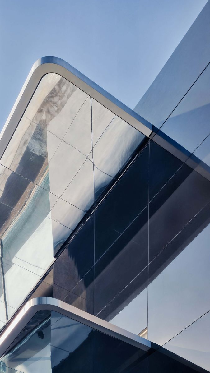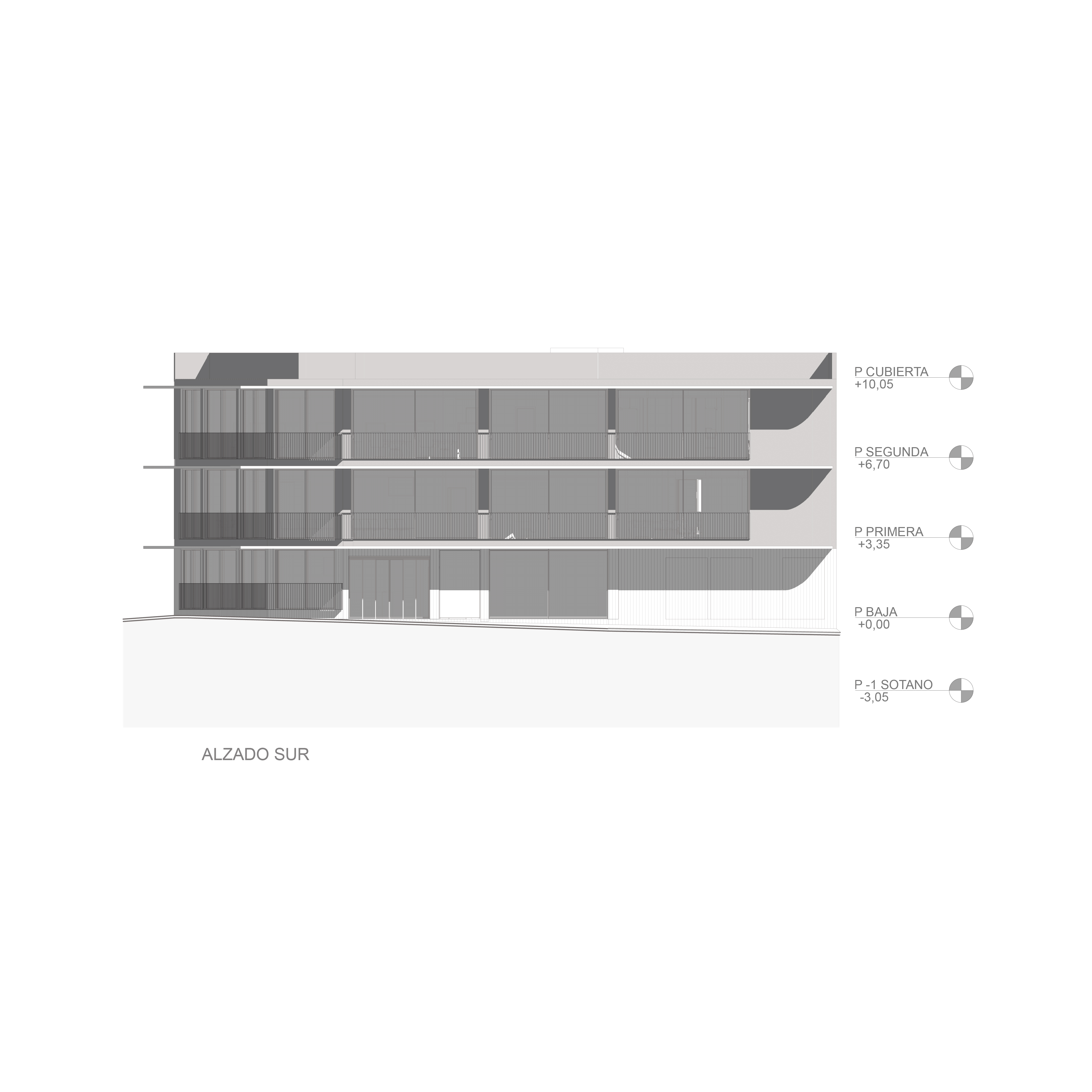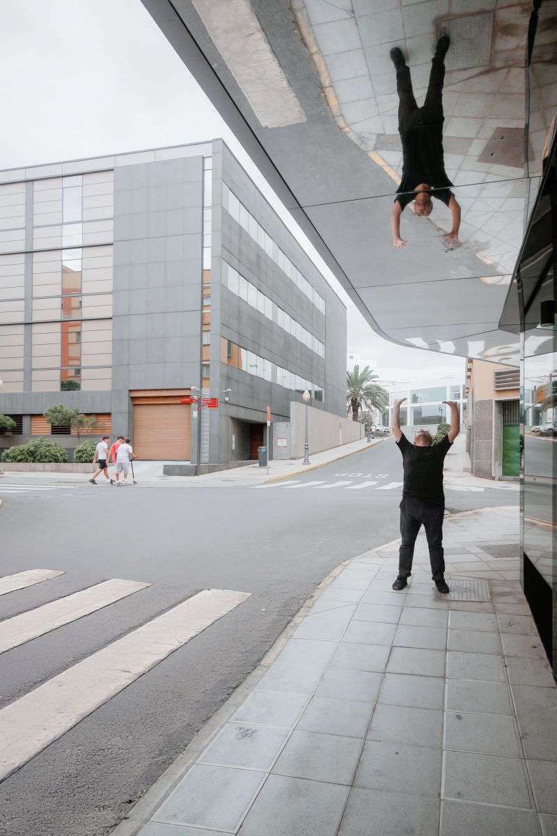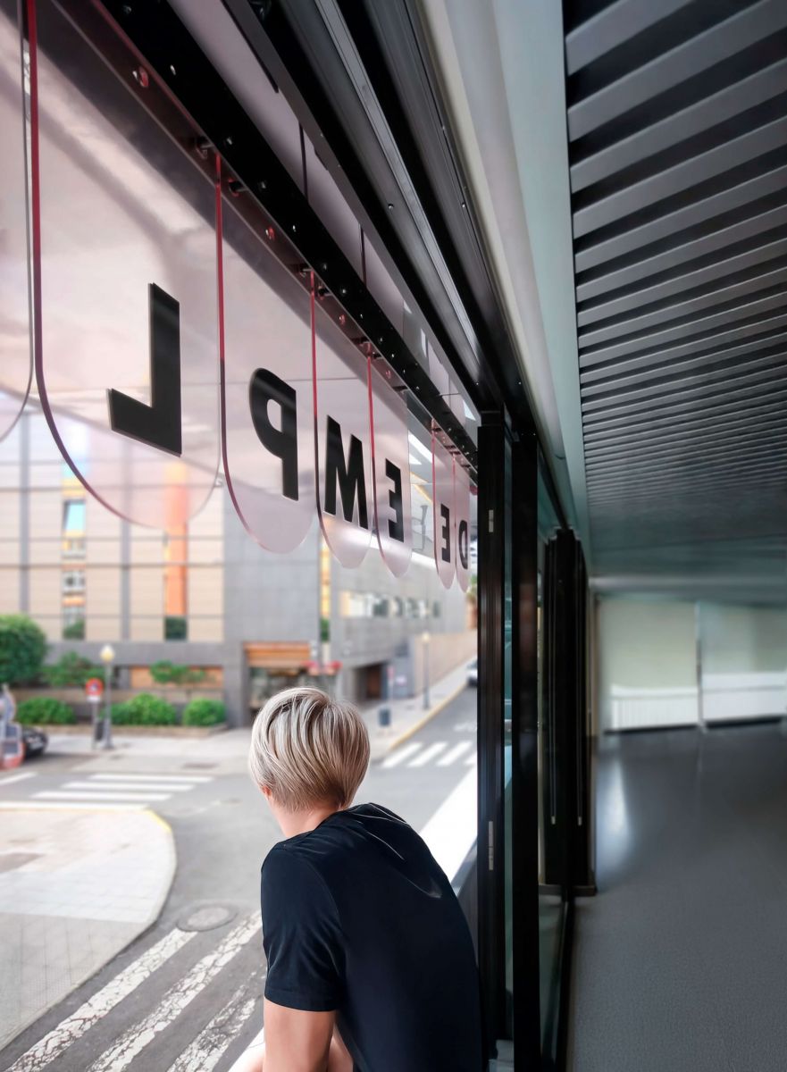 Los voladizos se conciben como grandes espejos hacia la calle que cumplen una doble función. Por un lado, intervienen en la regulación del intercambio energético edificio-entorno a través de la graduación de la radiación solar. Por otro lado, reflejan en colaboración con los acristalamientos, la imagen del cuerpo a medida que este activa dinámicamente el espacio exterior de la calle y el interior del inmueble. Este intercambio continuo de información conecta metafóricamente la presencia material del edificio y el uso al que está destinado.