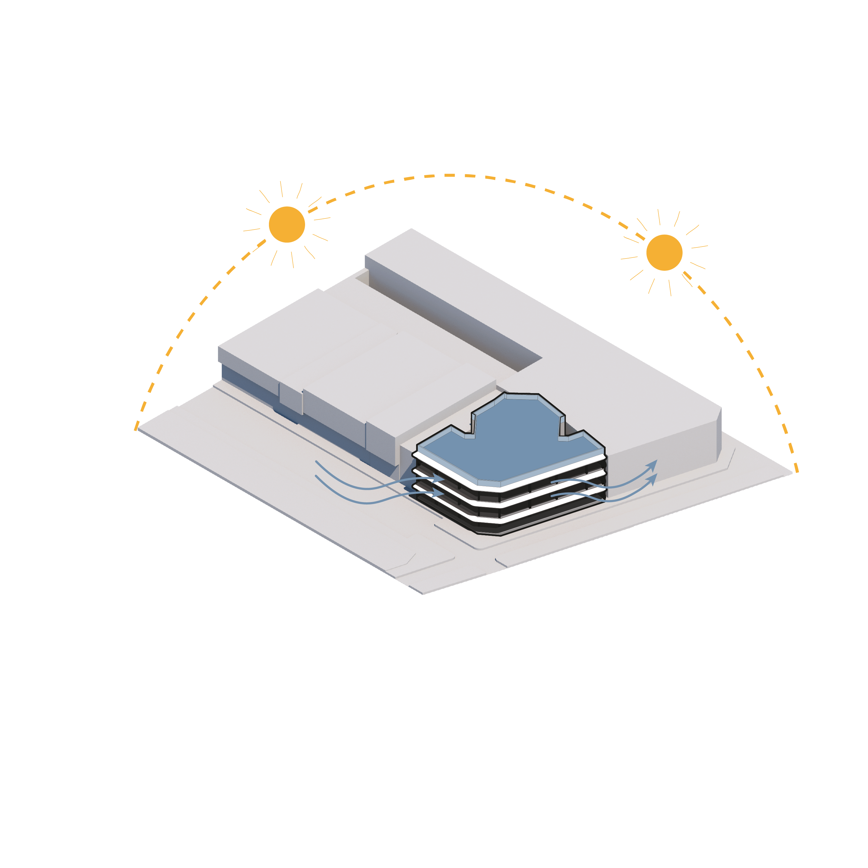 Se introducen tres elementos de protección pasiva: voladizos pronunciados y capas de aislamiento incorporado a la envolvente, que permiten a su vez grandes acristalamientos practicables con tecnología de control solar integrada. A todo ello se une un planteamiento de las instalaciones altamente eficiente, diseñado por la ingeniería encargada del proyecto.