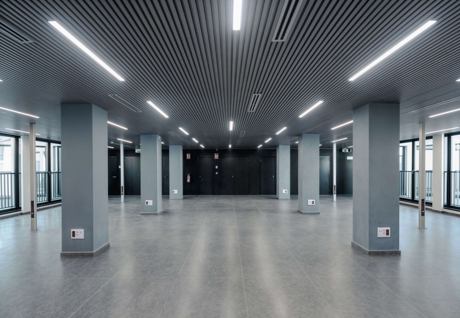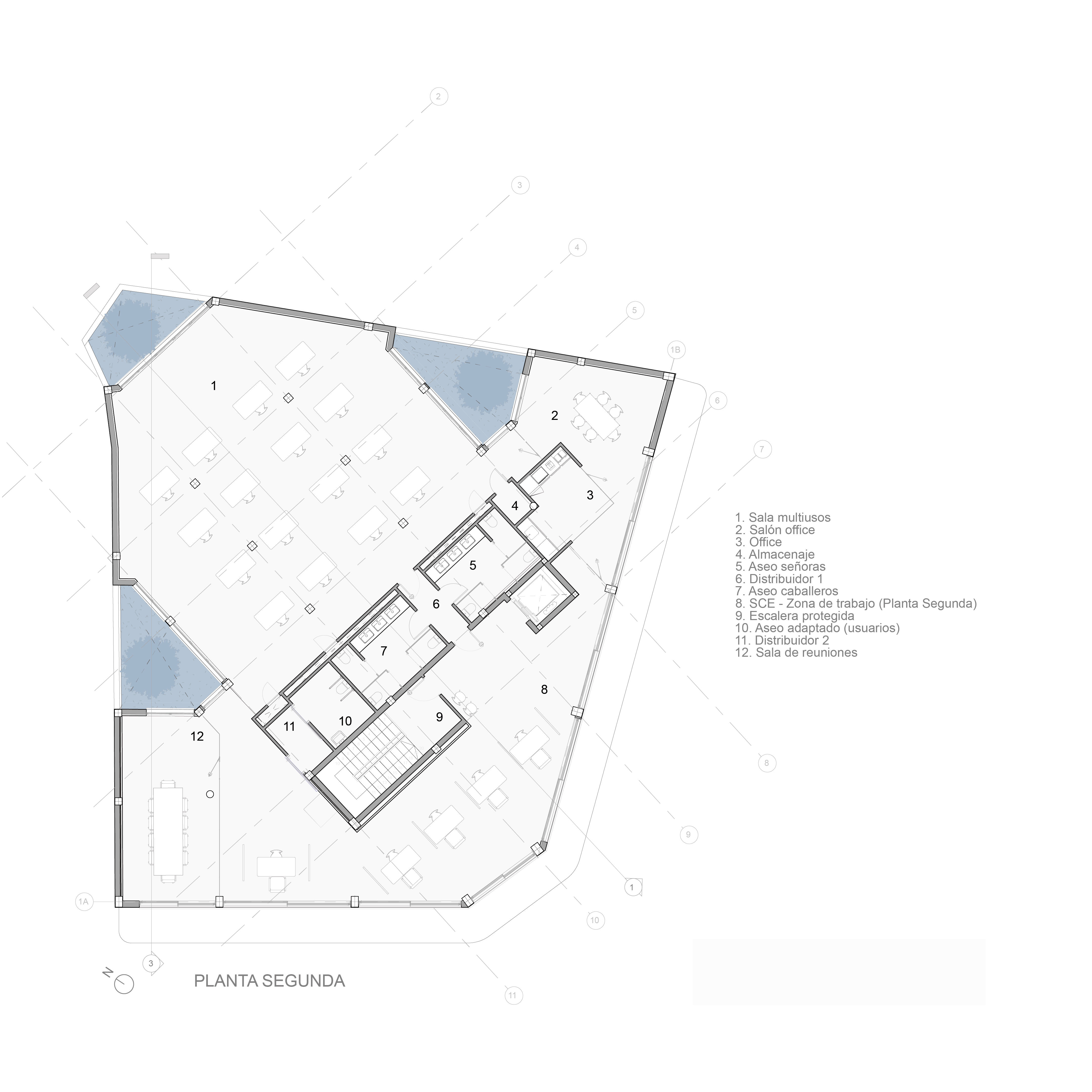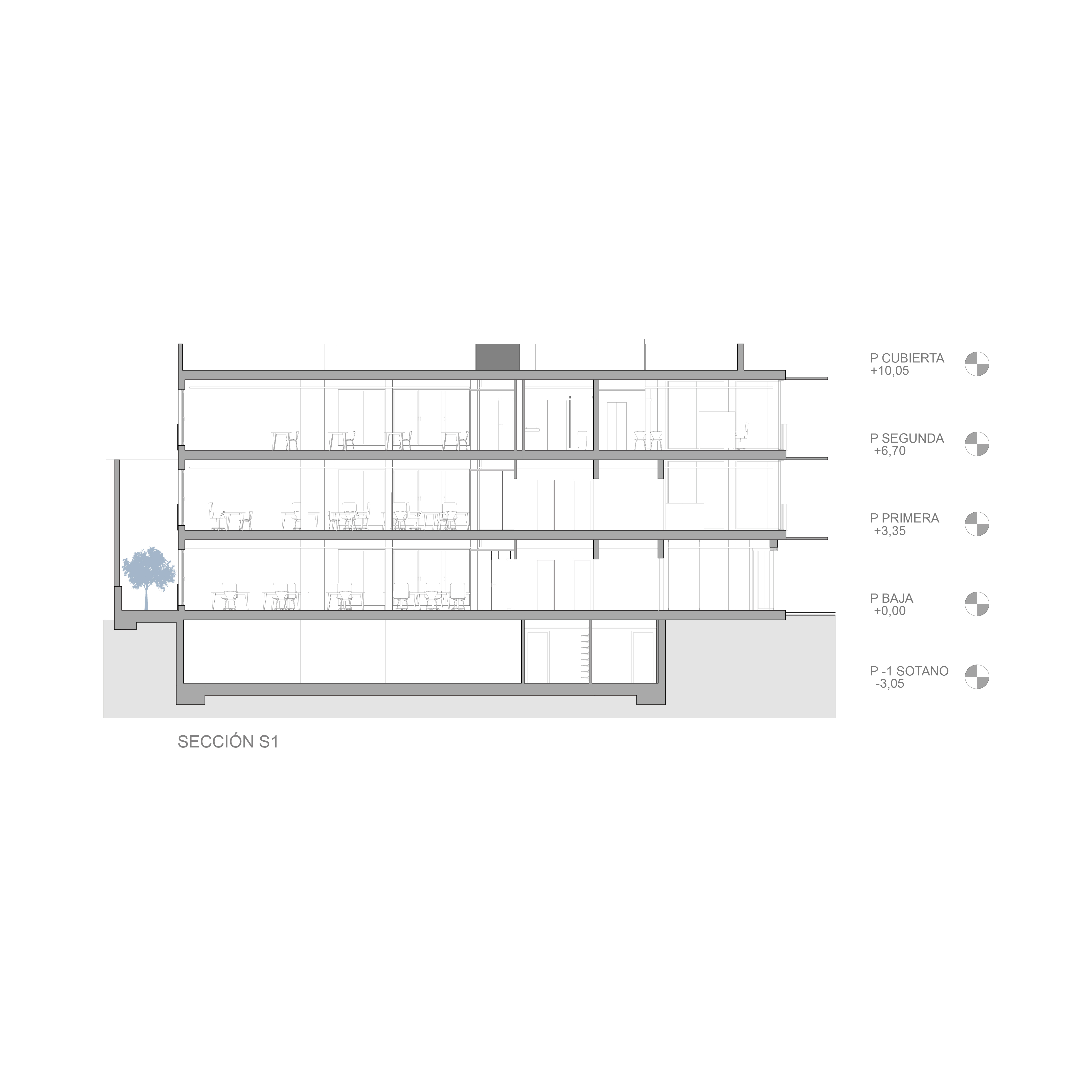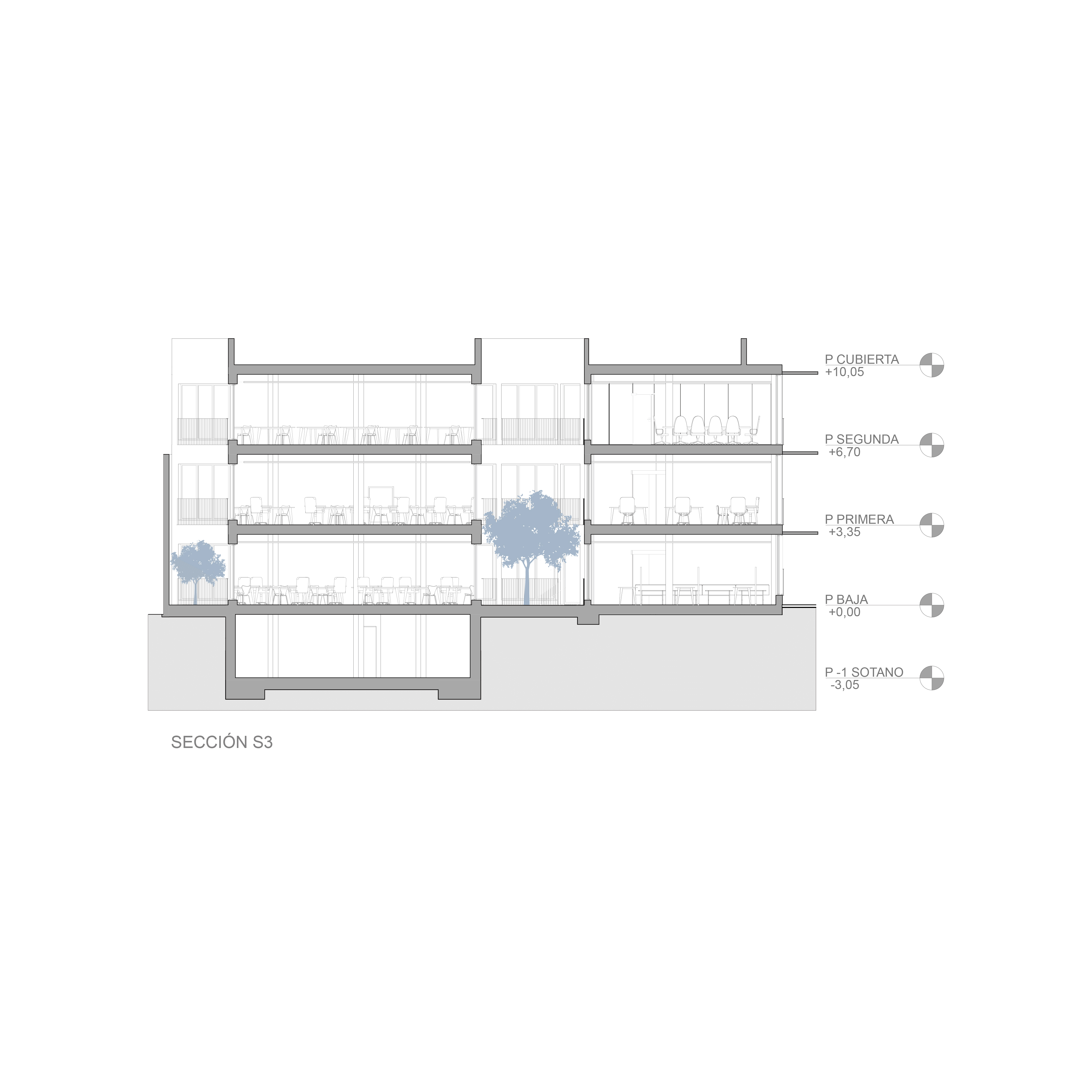 El inmueble original fue remodelado completamente con el objetivo de producir un espacio de trabajo saludable a través de un detalle constructivo de fachada técnico, práctico y de mantenimiento asequible. Este detalle da respuesta a una estrategia de gestión energética que consiste en la combinación de dos exigencias: máxima captación de la iluminación y la ventilación naturales y máxima regulación de la radiación solar no deseada.