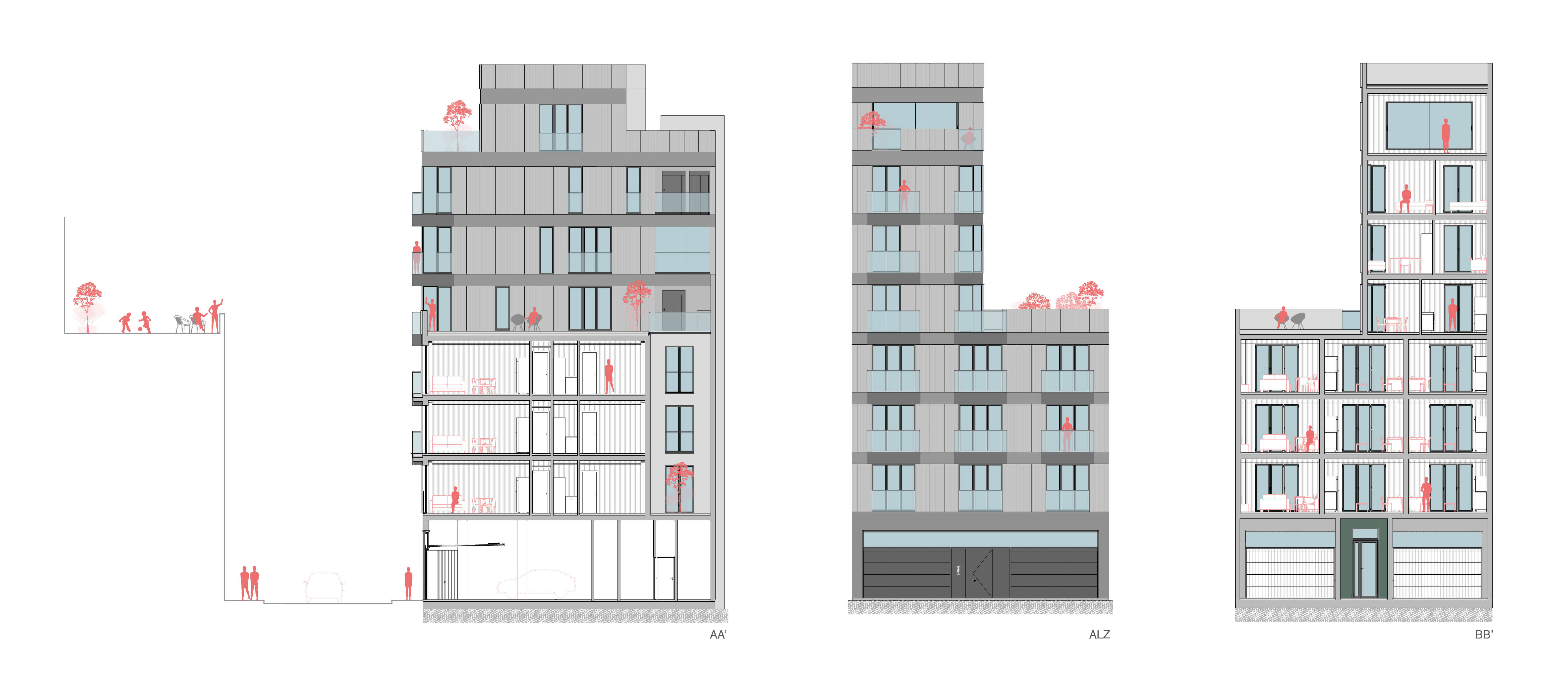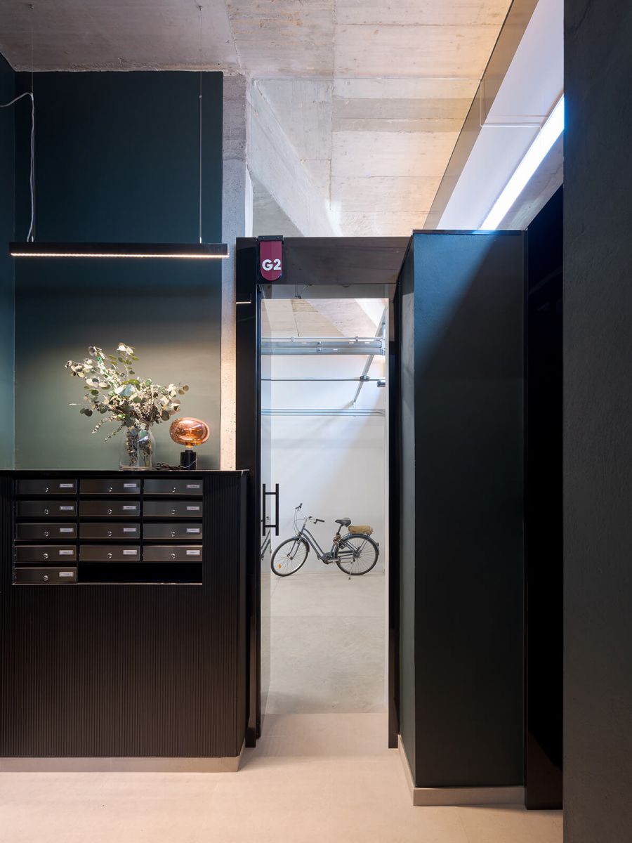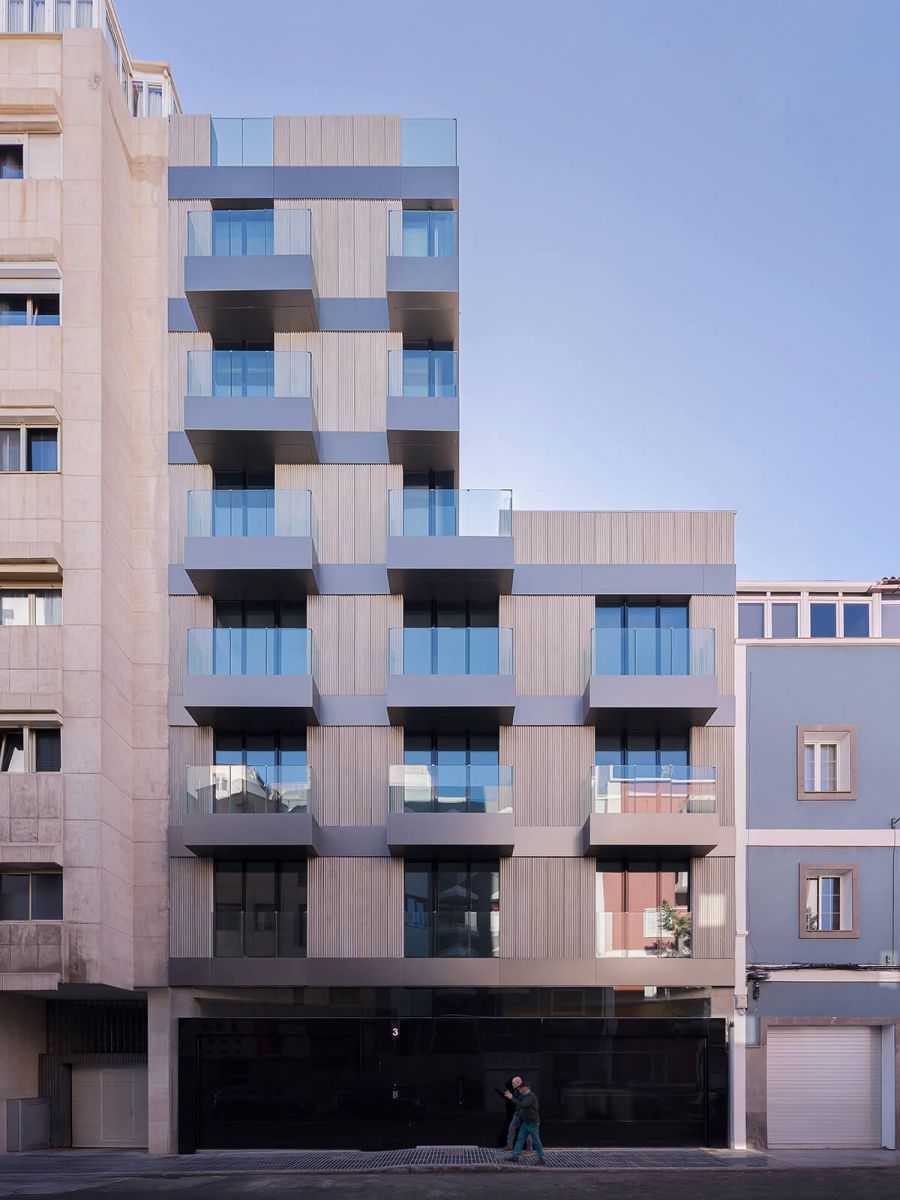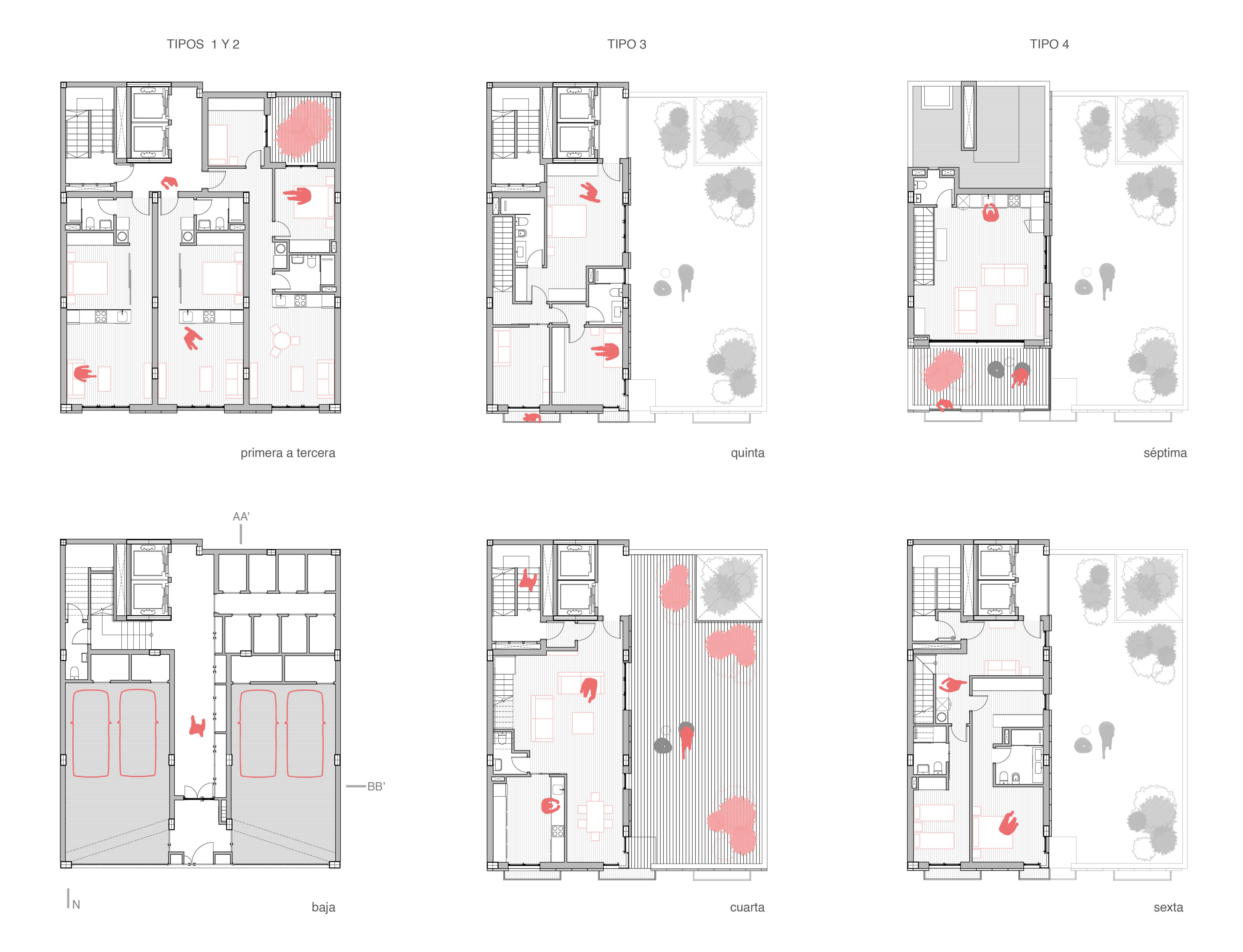 Tipológicamente, el edificio articula en mismo soporte arquitectónico, una organización compleja de unidades destinadas a uno, dos, cuatro y cinco ocupantes, en respuesta a la diversidad real de estructuras familiares, ciclos vitales, capacidades económicas y formas de movilidad urbana. La vivienda de menor tamaño es un estudio modulable mediante paneles móviles, mientras que la unidad de mayor dimensión incorpora un acceso directo en ascensor privado desde su garaje a su salón. Esta heterogeneidad programática refuerza la adaptabilidad del conjunto y posibilita la convivencia de múltiples modos de habitar.