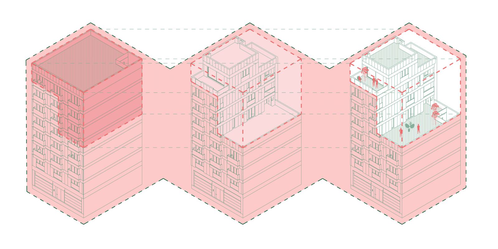 El edificio y el barrio se conciben como un sistema vivo, relacional y adaptativo, capaz de intercambiar energía e información. La azotea emerge como un campo común de coproducción urbana, donde la calidad arquitectónica actúa como catalizador social. El proyecto aspira, en última instancia, a activar un proceso de transformación progresiva del barrio, incentivando que los propios vecinos reactiven sus cubiertas como espacios cualificados, saludables y compartidos.