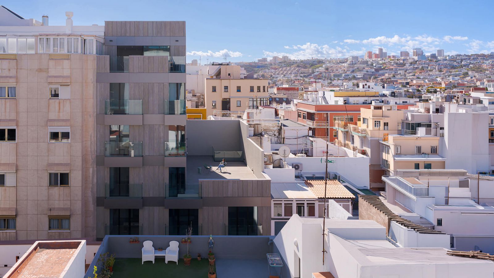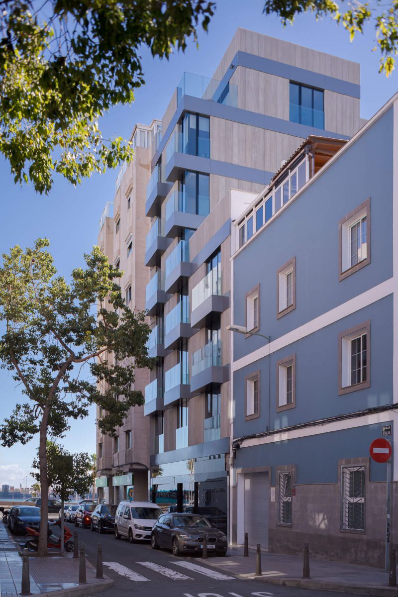 El edificio se implanta en el barrio de Alcaravaneras, en Las Palmas, entre una transitada autovía, la playa y el mar, inmerso en un tejido urbano denso, entrópico y crecientemente amenazado por dinámicas especulativas derivadas del desequilibrio entre el incremento del parámetro de edificabilidad y la persistente escasez de vivienda.
